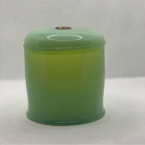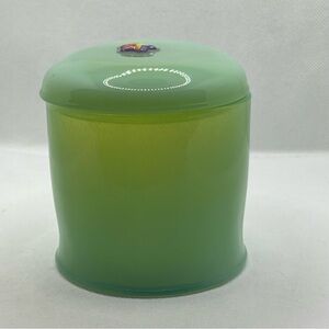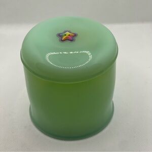 Charming green glass jar with a colorful star on the lid. Perfect for storage or decoration.