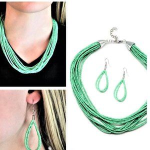 Infused with two large silver fittings, refreshing Green Radiance glass seed beads are threaded along countless strands, creating dramatic layers below the collar for a seasonal look.