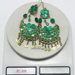 Green Glass Stone Kuchi Earrings: Tribal Tassel Dangle Jewelry