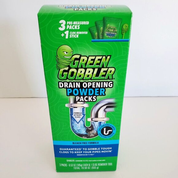 The Green Gobbler 6.53 oz. Drain Opening Powder Packs are a commercial/residential drain cleaner designed for sinks, showers, toilets, and more. The pack includes 3 treatments with a clog remover tool, and the powder form is compatible with multi-purpose pipes. The product is septic-safe and made in the United States. This cleaner effectively removes clogs and is suitable for various drain types. The compact pack size makes it convenient for on-the-go use, and the brand reputation ensures quality and effectiveness.