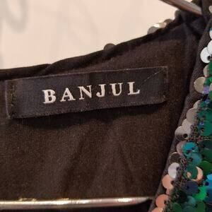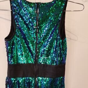 Green Goddess Sequin High Slit Maxi Dress Evening Plunging Neckline Size S. Snap crotch black bodysuit in the high slit bodycon evening gown by Banjul. Stretch sequin fabric with sexy back zip. Measures laid flat approx. 16 inches chest, 13 waist, 15 hips, 50 length. Excellent pre owned condition. Size S