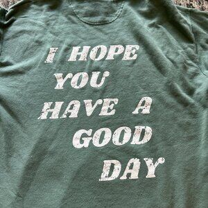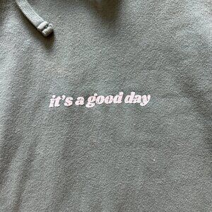 front says "it's a good day" the back says "I hope you have a good day" cute hoodie with positive affirmations. worn lettering look; runs big