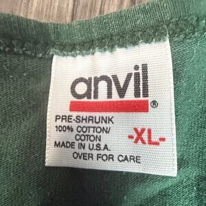 Dark green tee featuring a colorful wildflower / botanical graphic on front. Tag reads “Anvil Preshrunk 100% Cotton Made in USA.” Single-needle hem stitching. No branding on front aside from floral art. Soft, comfortable cotton. Casual, garden, nature, floral, botanical aesthetic. Perfect for layering or on its own.