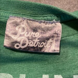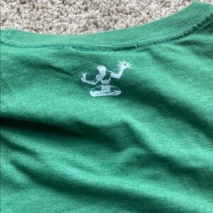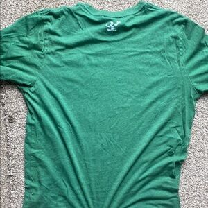Green t-shirt featuring a graphic print of city names and a shamrock.