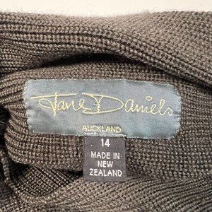 Jane Daniels Auckland. High end fashion, from Winter 2002 collection. Made in New Zeeland wool acrylic blend. Drop shoulder, boxey sweater has a nice weight to it. Color is a charcoal to dark army green. Material has a horizontal ribbed texture.