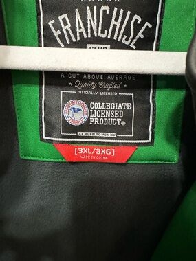 softshell jacket in green with gray accents. Lightweight, water-resistant outer shell for everyday wear. Zip-front closure with zippered pockets for secure storage. Comfortable collar and articulated sleeves for easy movement. Branded detailing for team pride.