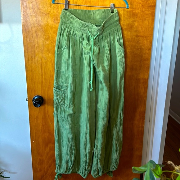 Bottoms are tied and can be adjusted to be cinched or wide bottom.