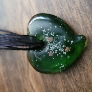 Elegant green heart-shaped glass pendant perfect for adding a touch of art to your home decor. The vibrant green color brings a fresh and lively feel to any space.