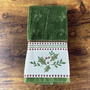Festive green towel featuring a holly design. Perfect for holiday decor.
