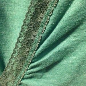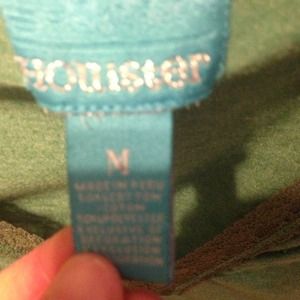 It's a very cute V neck top with lace on the trim. It has the Hollister bird located at the bottom left corner. Very cute for fall. Thin enough to wear even in the summer.
