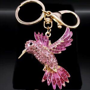 Pink and Green Hummingbird Keychain for Women Men Rhinestone Gold Color Alloy Animal Birds Purse Bag Key Chain Jewelry