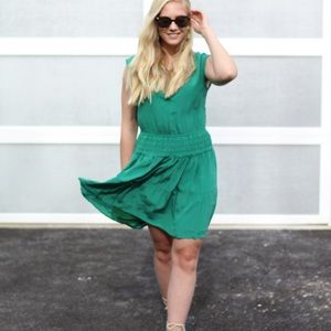 Green dress from J.Crew (size 4) in excellent condition (like new). Only worn twice and is a beautiful dress. 100% silk and lined with 100% polyester. Lightweight material, ruching at waist.