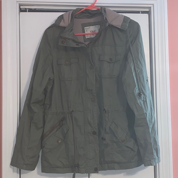 Has hood, buttons, zippers, and lots of pockets. Inside is a soft material.