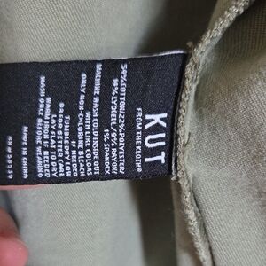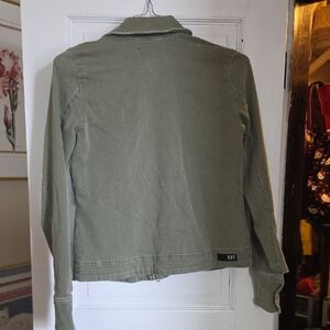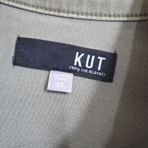 Kut from the Kloth lightweight jacket in olive green. Button and zipper front closure. Multiple pockets for utility and style. Easy layering piece for casual looks.