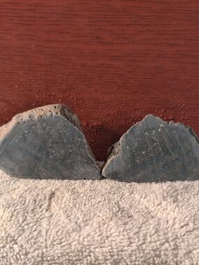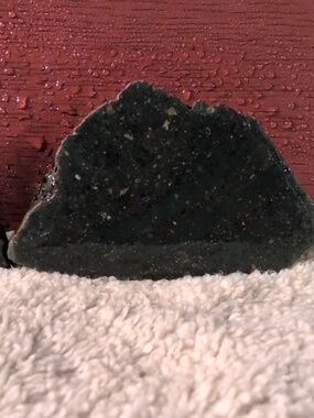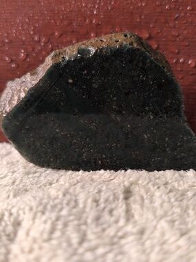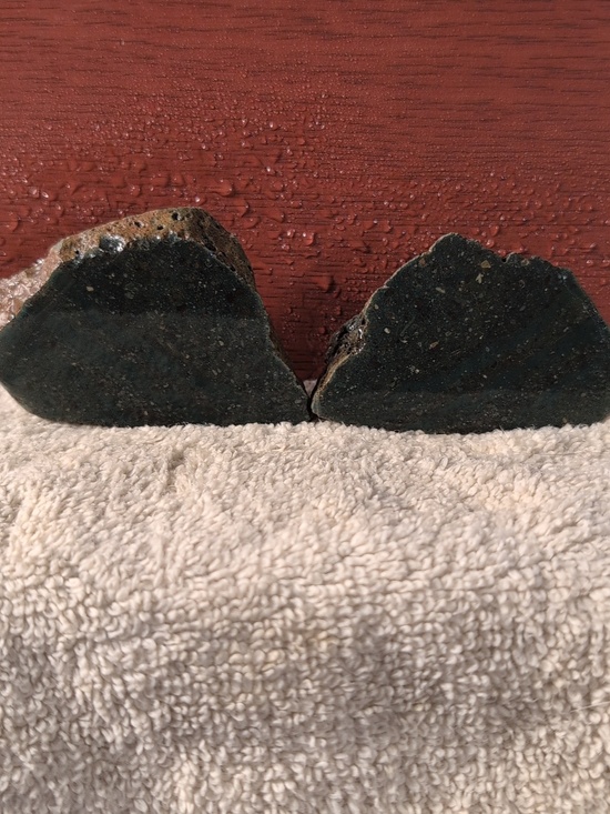 Green Jasper. This was one piece that has been cut into two. This is rough-cut and unpolished. There are saw marks. This has been pictured wet and dry. These look best when wet, clear coated, or polished approx 3" X 2.25".
