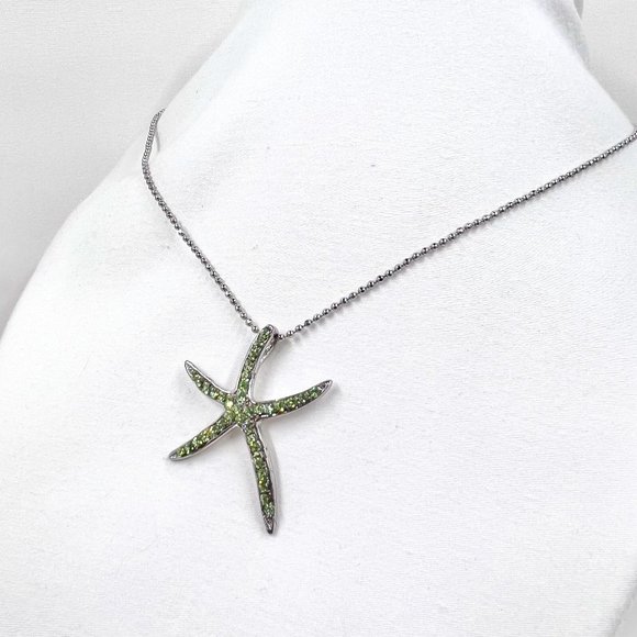 Green Jeweled Starfish Pendant Silver Tone 16” Ball Chain Necklace