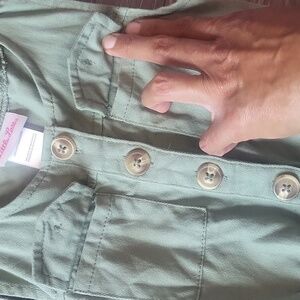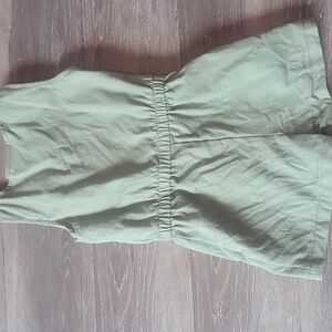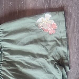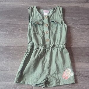 This stylish green romper features charming floral embroidery, perfect for playful days. Crafted for comfort and style. Pre-owned, Good condition!