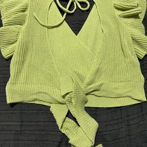 Chic and stylish green knit top with an open-back design. Perfect for a trendy look.