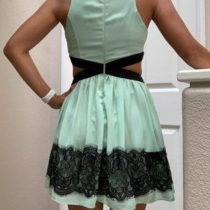 EUC* Sleeveless mint green dress with black contrast waist and black lace hem. High neck. Side cutouts. Back Zipper. Flowy a line skirt. Lined.