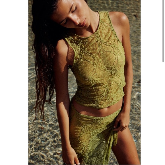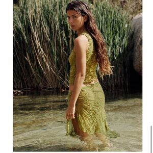 Elegant green lace set featuring a sleeveless top and matching skirt. Perfect for a stylish look.