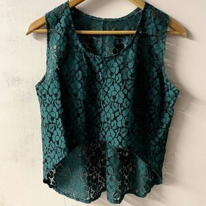 Beautiful deep green colored hi-low crop top with a lacey floral design! In excellent used condition! This would be cute with a black cami under tucked into some mom jeans or even a black fitted skirt and some black sandals or booties! Approximate measurements shown in photos. Feel free to ask questions or make an offer!