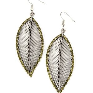 Bordered in dainty green rhinestones, a life-like stenciled silver leaf swings from the ear for a dash of glitzy whimsicality. Earring attaches to a standard fishhook fitting.