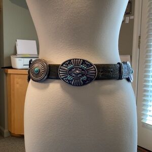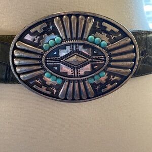 Gorgeous western style silver and turquoise belt. Leather has some peeling, but other than that in great condition. This belt does have weight to it. Great with jeans or around a shirt. Very pretty.