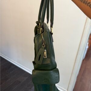 Stylish green leather handbag featuring a striped interior. Perfect for everyday use.