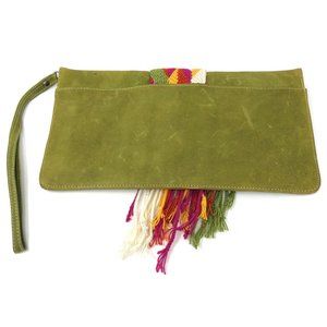 Lime Green, genuine leather, oversized clutch. It features this beautiful braided string pattern that comes up from the back and runs down the front. The strings then drop into a multitude of different lengths and colors. This is the kind of handbag that can be worn well during the day with rolled up jeans and your boyfriends white button down, or with that sexy black dress that's open in the back and shows off your skin from your neck to your waist.