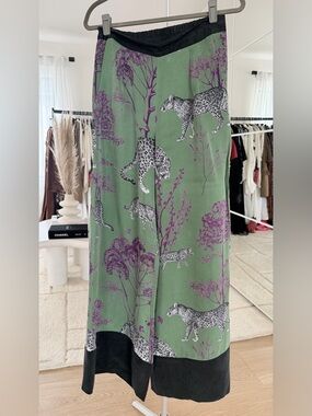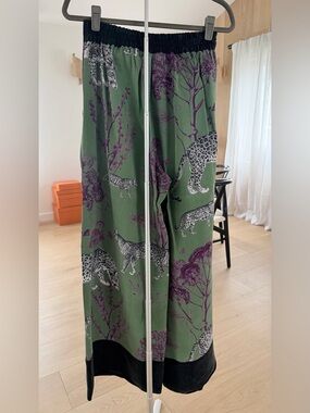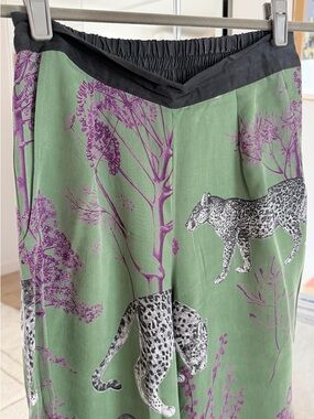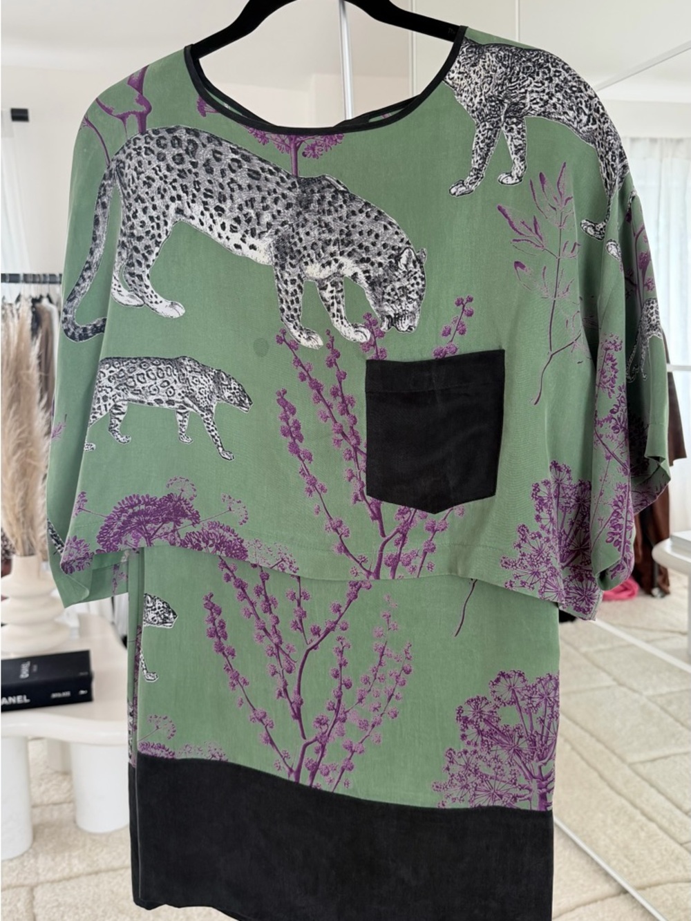 Lightweight green top and pants featuring a bold gray leopard print and purple floral accents. Includes a contrasting black chest pocket for a modern touch. Easy, relaxed fit designed for everyday comfort and style. The green and purple palette creates a unique, eye-catching look.