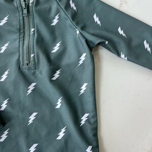 Stylish green swim set with white lightning bolt pattern. Includes long-sleeve top and shorts.