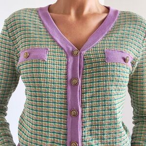 Green Lilac Purple Plaid Tweed Knit Cardigan with Gold Buttons | Size S-M
