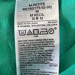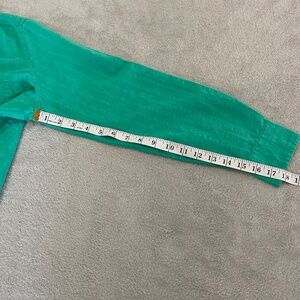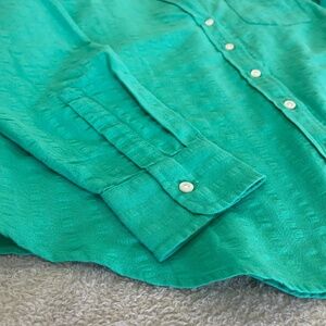 Green V-neck button down in a soft gauze-y crinkle texture. It's long sleeve with button cuffs.