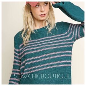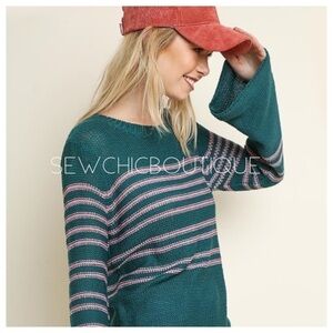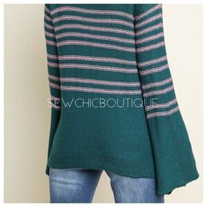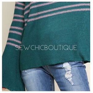 Pretty Green Colored sweater with light pink thin stripes horizontally across the chest area that stop at the upper belly area. This sweater features extra long bell sleeves & no defined bottom hemline or cuffs. It looks like a long oversized t-shirt with no hem & long bell sleeves. It’s soft & lightweight with an unfinished bottom but no frills, distressing or destruction.