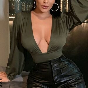 This SHEIN bodysuit in a striking green color features a fitted design with stylish cut-out details. The long sleeves provide a sleek and elegant look, perfect for any occasion. Made from a soft, stretchy material, it offers both comfort and a flattering silhouette.