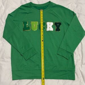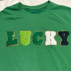 Vibrant green sweatshirt with 'Lucky' text in multicolor design.