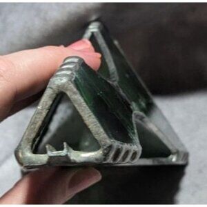 Beautiful hollow pillar made from panels of green marbled stained glass. The top and bottom are triangular, and it's larger at the bottom that the top. It has cutouts on the sides, the bottom is made from clear class, and the top is open. There's a metal piece at the top that looks like something used to be attached to it, but I have no idea what. It does need some cleaning, as there is some clay or something inside the bottom. Perfect for unique decor, using as a tealight holder, or upcycling!