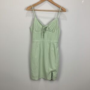 Cute mini dress with a tie up bust, thin adjustable straps, zip at the back and a mini leg slit. Thin lightweight material with stretch.