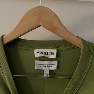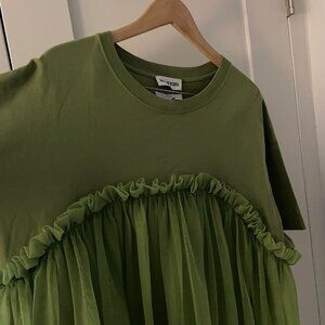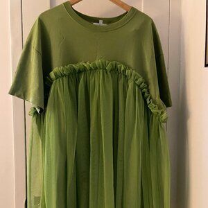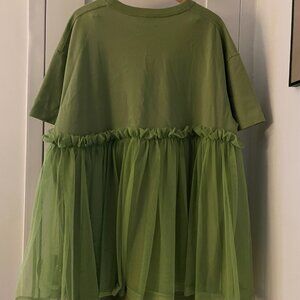 Green cotton dress with green tulle overlay. Empire waist. Two small pinholes in the tulle.