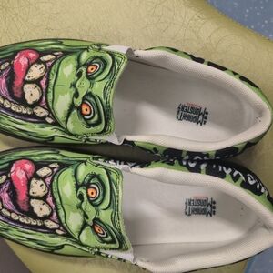 Midnight Monsters Slimer Shoes. Vibrant green slip-on shoes with a bold monster graphic. Comparable to Vans. Material is thicker.