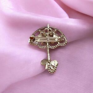 This is a super cute silver tone umbrella brooch. Adorn your bag or clothing with this little cutie and bring some attention to your way. It’s approximately 1.25” long.