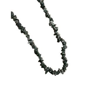 Petite and delicate green gemstone chip necklace. I believe these to be green moss agate. Measures 20" with a big shepherd's hook clasp.