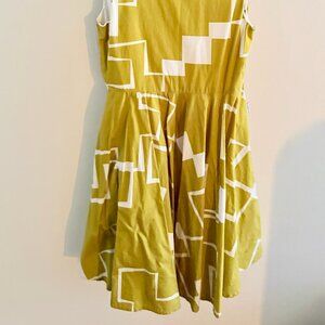 Sleeveless dress in green and white geometric print with fluent skirt.