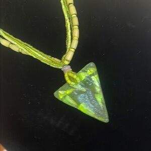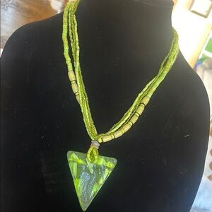 This exquisite necklace boasts a multi-strand chain of vibrant green beads, accentuated by a large, triangular glass pendant. The pendant's swirling green and blue hues create a captivating marbled effect, making it a standout piece. Its smooth, glossy finish adds a touch of sophistication to any outfit.