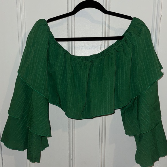 Elevate your style with this chic green off-shoulder ruffle top. Perfect for any occasion, this top adds a touch of elegance to your wardrobe. NEVER WORN