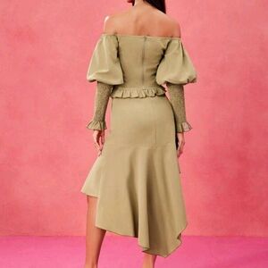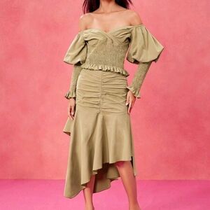 Green Off-Shoulder Smocking Ruffled Top And High Waist Ruched Asymmetrical Skirt