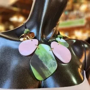 Olive Green, Green and Goldtone Statement Necklace with Earrings Set! Very lightweight and stylish. Easy to wear. Only one available in this color. Very lightweight and comfortable to wear. Pink and Green version is available and sold separately.