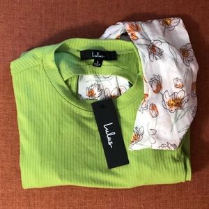 Green ribbed body-con dress. Open back with feminine floral tie. Size Large and fitted.