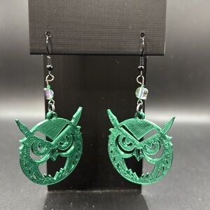 Unique green owl earrings. Handmade with love. Perfect for adding a playful touch to any outfit.