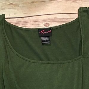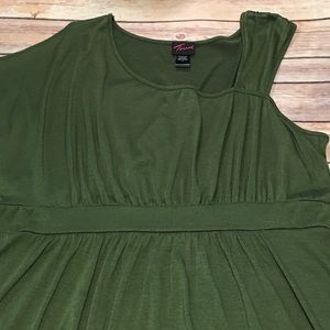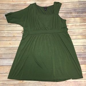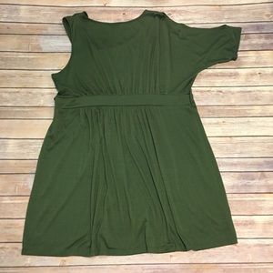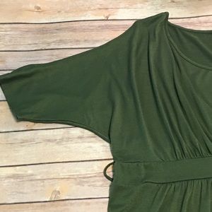 This dress has one exposed sleeve(not quite cold shoulder) on one side and a single strap on the other side. It has belt loops but I no longer have the belt it came with(belt in pic is mine and not included). Has kind of a asymmetrical neck/collar going on, not sure how to describe it. Olive green color.